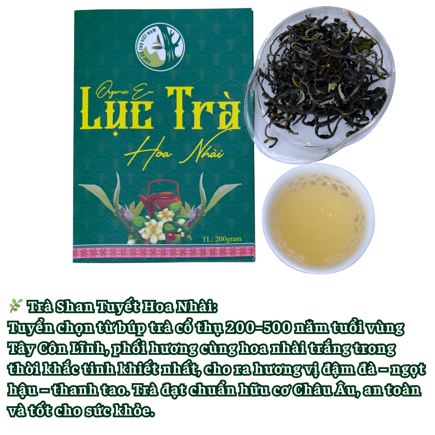 Nguyên liệu trà: Búp và lá non Shan tuyết cổ thụ (ước 150–500 năm tuổi), sinh trưởng tự nhiên