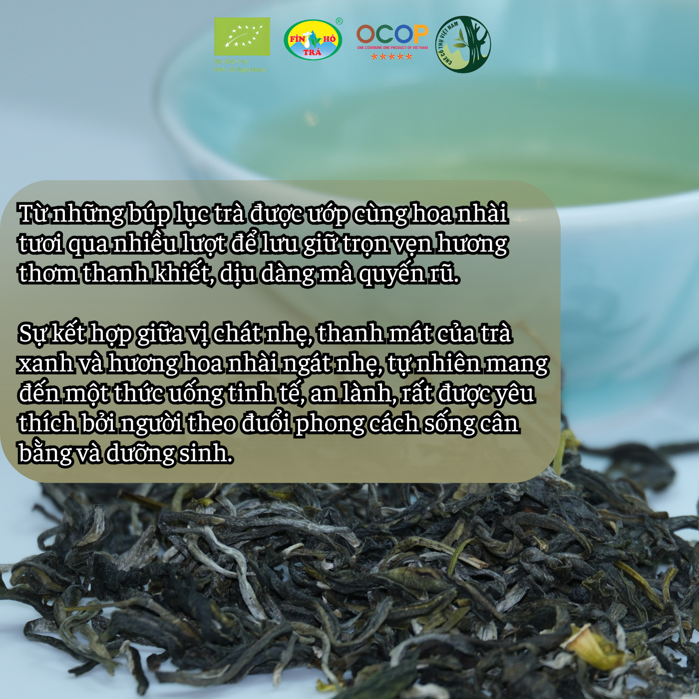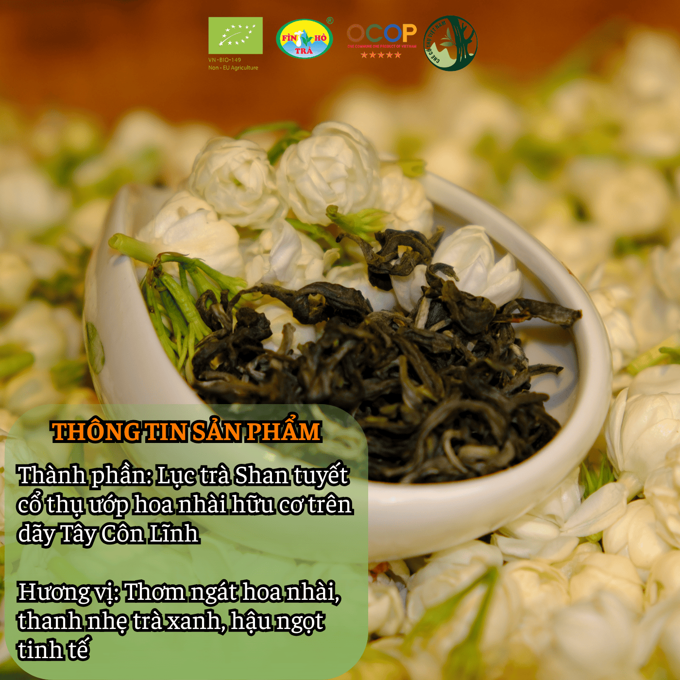 - Hương: Nhài tươi thanh khiết, nền cốm non thoang thoảng; mát lành như sương sớm miền núi.