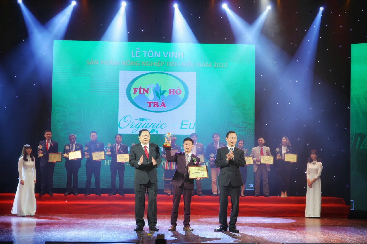 Đại diện HTX Chế biến chè Phìn Hồ nhận cúp trong lễ tôn vinh sản phẩm nông nghiệp tiêu biểu năm 2017